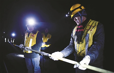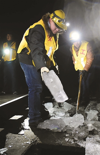 孙小军把一直扛在自己肩头的冰杆放在地上,开始组接。说到这个冰杆,这也算是工区里的一个打冰小发明,冰杆由若干1米多长可组接的短杆组成,其中一根顶端类似矛头。这种组接结构让冰杆长可够到7米高的拱顶,对于附在墙壁上的冰块也可以缩短以利于发力。拼接好后,孙小军攥住冰杆的一头,把矛头对准悬在墙壁上的冰块,一会儿工夫把这个渗点附近的冰全部清除干净。其他的职工便开始用皮斗、铲子把掉下来的冰块清除到排水沟里。对于挂在拱顶的冰锥,工人们也有着自己的小窍门,“一定要在一个方向戳冰锥,这样掉下来才不会砸到人。”孙小军说。