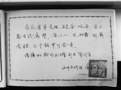 “有志者,事竟成,破釜沉舟,百二秦关终属楚;苦心人,天不负,卧薪尝胆,三千越甲可吞吴。”这是毕业纪念册的扉页上吴长信老师给我的赠言。吴老师是我师范三年级的班主任,我对他有一份特殊的感情,毕业二十多年了,这份感情一直埋在我的心底。