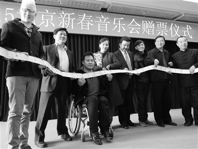 昨天,北京新春音乐会编导组来到市残疾人福利基金会,将音乐会的500张门票送到残疾人手上。于2月16日在人民大会堂举办的北京新春音乐会坚持每年的公益活动,今年除了向残疾人赠送演出票外,还将向100户职工家庭赠送。本报记者 邱勇 摄影报道