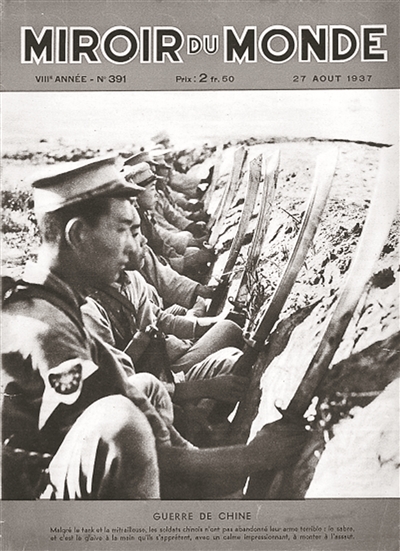 这张照片是1937年8月27日法国《世界之镜》杂志的封面。抗日战争中,第二十九军大刀队士兵在战壕中准备拼杀。年轻的脸庞,视死如归的表情和闪亮的大刀,把中国人的抗日决心传递给欧洲读者。