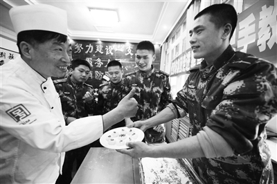 “我可得好好学学,在北京当了7年兵,真没机会吃北京小吃。”排长刘海双边看边小声嘀咕着。在里三层外三层的人群中,隋淼最为突出,他一手拿着白纸,一手持笔,靠在前面战友的背上,厨师每说一样原料,他就用笔记一下,好不认真。