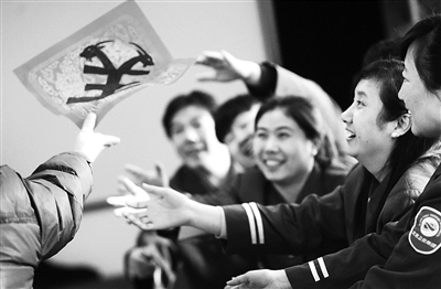 “送吉祥啦!”昨天,公交客三分公司十二队的职工之家内一片欢声笑语,车队的职工书法家挥毫为每名职工书写“羊”字。十余种不同笔体的羊字,引得职工一阵争抢。车队工会主席告诉记者,“羊”就是“祥”,工会把吉祥送给大家,祝福大家羊年工作生活愉快。本报记者 于佳 边磊 摄影报道