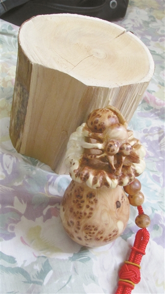 “这块木头我要把它雕刻成一个钱袋子的造型,就像这个一样。”高忠良从平时跨的包里拿出一个用白色塑料袋包裹的严严实实的东西,打开一看——一个拳头大小的钱袋子,钱袋口处还趴着一只蜘蛛。“这钱袋和蜘蛛都有很好的寓意,因此大家都比较喜欢。雕刻这个的时候就花了我半个月时间,所以过了春节差不多就好了。”