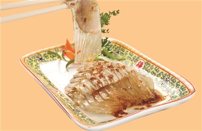 已有264年历史的砂锅居以烹制“白肉”享誉京城,水晶肘就是其中之一。精选“盘肘”,先将肘肉加入秘制调料煮熟备用,再将肉皮经过特殊加工熬制成胶状,把肘肉欹刀放入熬成的水晶汁中,经过20多个小时后冷却成型。食用时切成薄片,蘸上店家精心准备的酱汁,十分适口,不但色泽如水晶般剔透,味道鲜香,软滑可口,更是女性美容养颜的佳品,颇受女性的喜爱。