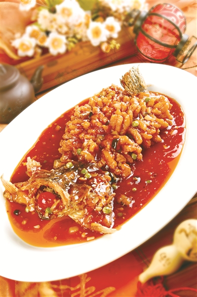 同春园以江苏风味著称。该店松鼠桂鱼做法:桂鱼切成花,盐水浸泡5分钟;松子剥仁,豌豆焯熟;桂鱼裹生粉后,拍掉多余生粉;热油锅炸鱼呈金黄色捞出;另一锅,留少许底油,放蕃茄酱炒至油发红,倒水,调盐,多一些糖,适量白醋,勾水淀粉推匀。炸好的桂鱼放盘中,淋上勾好的糖醋汁,洒上熟豌豆及松仁。如同可爱的小松鼠跃然盘中,“头昂尾巴翘,浇卤吱吱叫”,让人不忍动箸。