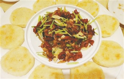 创于1937年的南来顺饭庄,以爆、烤、涮羊肉以及爆肚闻名于京城。南来顺的“爆糊”是镇店名菜。爆糊主要食材:肥瘦相间的羊后腿肉切成薄片,勺上火,放油烧热,将肉片放入翻动,放入姜汁料酒蒜末,再放入一寸长的大葱,至肉片成金黄色时,用温火翻炒十五分钟,待肉片散发出糊香味加入蒜片,香菜段盛盘。吃时将爆糊放进小火烧里夹着吃更有味道。