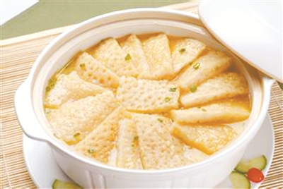 美味斋饭庄以制作上海本帮菜为主。三鲜肉皮汤是本帮菜的一道名菜。做法是,干肉皮切成块,冷水满盆,把干肉皮用重物压在水底。浸2至3小时后,肉皮显松软厚状,切中块。取砂锅小火慢炖猪蹄、咸肉至鲜汤,肉品炖酥后加入鱼圆、冬笋等辅料。鲜汤放好调味品,就可放入肉皮,肉皮如海绵般把汤汁汲入。撒上小葱、少许胡椒粉,装盆上汤。这是道鲜而不腻的本帮名菜。