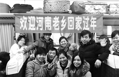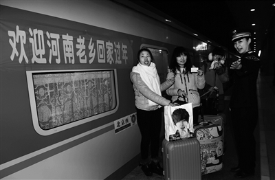 6时15分,随着汽笛的一声长鸣,K4079次列车缓缓进入北京西站1站台。虽然距7点20分的发车时间还有足足一小时,但开发区总工会的工作人员已经早早等候在这里。记者看到,开发区总工会给职工精心准备的大礼包中不仅有水果、烤鸭等食品,就连洗漱用品也一应俱全。更让人感动的是,那张贴在列车上“欢迎河南老乡回家”的火红标语,不仅温暖着渴望回家的游子的心,更是提早地透出了春节的喜庆。