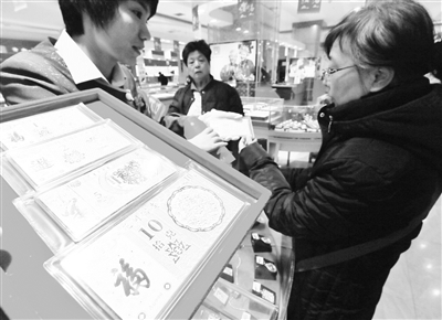 春节前的黄金卖场节日促销已经开始,随着理财投资观念的深入,买黄金饰品给孩子当“压岁钱”的家长越来越多,上周末,黄金卖场的羊年贺岁产品销量增六成。昨天,记者从国华商场的“黄金大集”上看到,羊年饰品的柜台前挤满了顾客,生肖金条、金币、金钞等贺岁产品,充满了浓浓的年味儿。本报记者 孙妍 摄影报道