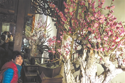 颐和园第四届“傲骨幽香”梅花、腊梅迎春文化展,日前在谐趣园内涵远堂殿堂内拉开帷幕。此次展览以“松、竹、梅——岁寒三友”等元素为题材,并配以中国传统书画,为游客送上新春的祝福。本报记者 邱勇 摄影报道