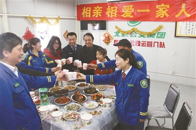 春节前,公交668路车队会议室内,三对双职工家庭围坐在“相亲相爱一家人”的横幅下,有说有笑地享用着车队工会为他们提前准备的“年夜饭”。