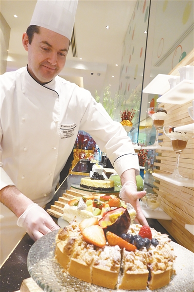 弗雷德里克在中国的时间不算长,但是对中国传统文化却有一些自己的理解,因此,今年春节他专门设计制作了一款以“喜庆”为主题的西点系列。这个系列的西点不仅从造型、口味和餐饮摆台都将传统的中国元素与西方浪漫融合在一起,既有祥和的中国传统文化的内敛,也有法国西点的精致和浪漫,“春节期间我会亲自将‘喜庆’系列的西点奉献给来酒店用餐的客人,希望大家的味蕾中也弥散着节日的欢愉。”