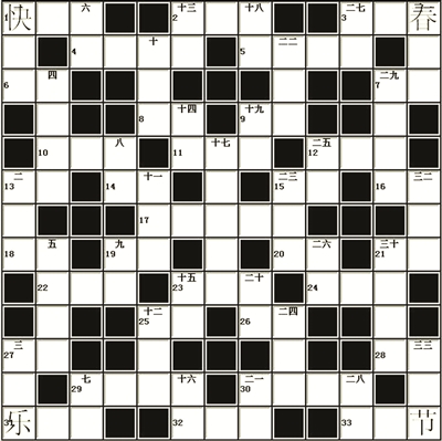 这则填字游戏共有66个词条,四角嵌入“春节快乐”四个提示字,表达了对广大读者的新春祝福。请根据横向、纵向编号在图中的位置以及提示完成全部词条。每个词条的提示都是三个词语或短语,它们都跟词条有关,请据此确定每个词条。