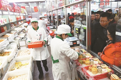 | 每年春节,拎个点心匣子去亲戚家串门,是老北京的风俗。在稻香村柜台前排满了等待包装糕点礼盒的顾客。 |