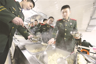 | ▲“韭菜馅儿的,比我妈包的还好吃!”在西客站值守的武警北京市总队三师十六支队十中队的官兵们吃上了热气腾腾的饺子。这是恒兴物业管理集团,连续第四年为春运期间值守西客站的武警官兵提供后勤保障。 |