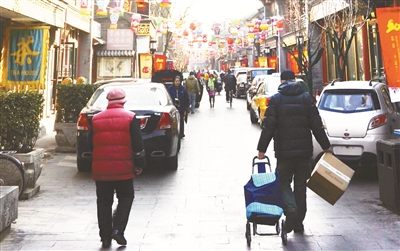 | 京城琉璃厂的胡同,各式各样的民族花灯挂满了街道。街坊邻居用小拖车拉着采购回来的年货相互打着招呼。 |