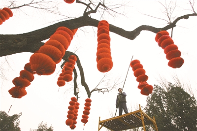 | 各大公园里,工人师傅抓紧时间悬挂大红灯笼装点园子,等候大年三十这天来赶庙会的人们。 |