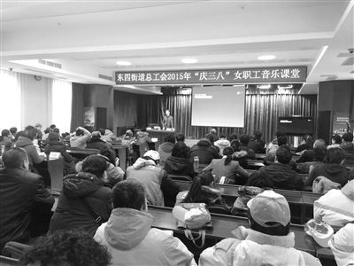 东四街道总工会近日联合街道妇联、文明办,邀请中央音乐学院副院长周宏涛为辖区企业百余职工上了一堂音乐欣赏课,受到职工好评。街道工会相关负责人说,让高雅艺术走入职工的工作生活中,有助于提升职工素质修养,特别是陶冶女职工情操,为推进职工文明建设奠定基础。本报首席记者 边磊 摄影报道