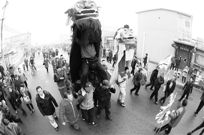 村头雪后空场上的积雪在清晨就被村民清除干净,成为简易的开幕式会场。开幕式简捷但很隆重。杨宋镇党委副书记温春霞致新春贺词并宣布传统民俗踩街活动开始。北年丰村13支民俗表演队,加上外村一支表演队依次走上村内宽阔的街头进行踩街表演,这是村里的传统花会,被称为“善缘老会”。