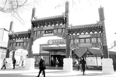 昨天,一座位于地铁四号线西四站入口处的牌楼露出真容,消失60年的西四牌楼回来了。牌楼高约十米,主体是水泥结构,颜色以红、绿、蓝为主,正中写着“行义”二字。据悉,牌楼从去年夏天就开始复建,由西城区政府、北京地铁四号线投资有限公司联合编制设计方案。本报记者 孙妍 摄影报道