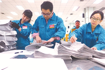 昨天凌晨,北京报刊发行局市内发行科生产现场人头攒动。在两会用报专用分发台席上,一个小伙子将数好的一大摞报纸推给下一环节的同事。他就是2014年市“职工技协杯”职业技能大赛冠军康黎明。报刊发行局为做好全国两会用报服务工作,抽调业务精、能力强的员工参与,使技能人才在两会服务中发挥作用。本报记者 边磊 摄影报道