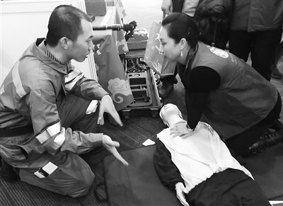 “按压位置在两乳连线的正中点,按压时身体前倾,按压深度大于5厘米,一分钟频率大于100次……”昨天,北京市综合应急志愿服务队医疗队副队长石洪和同事忙着为参观者讲解心肺复苏技能。为了帮助大家更好地掌握技能,应急服务队把一个假人搬到现场,让参观者了解急救知识后“现学现用”。