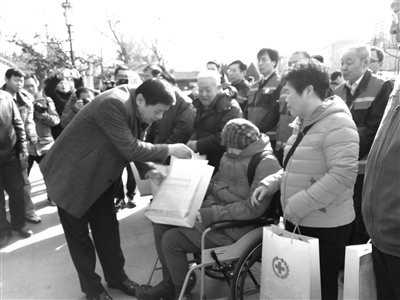 近日,北京市红十字会组织全市红十字志愿者开展以“人道关爱温暖京城”为主题的首都红十字组织学雷锋志愿服务系列活动。活动现场,市、区红十字会领导分别向参加活动的残疾人赠送了“连心杯”,向出租车司机赠送了红十字车载救护包。红十字会志愿者现场还传授了逃生避险、自救互救常识。本报记者 黄葵 摄影报道