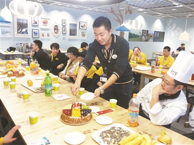 每个月的25日,是宜家家居西红门店职工特别期待的日子。因为在这一天,公司工会将为该月过生日的员工举办集体生日party。工会工作人员买好蛋糕、水果、零食,并准备了生日礼物和互动游戏。“我们会选出当天过生日的人为大家切蛋糕。期间还会进行游戏接力,传到谁,谁要站起来介绍一下自己,并表演一个节目,大家玩的特别高兴。”张英笑着告诉记者,他们已经举办了13次集体生日party,人数多的时候,有20多人一起过生日,特别热闹。