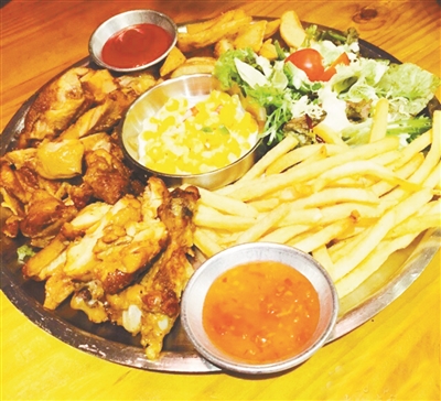 推荐理由:韩国人开的餐厅,不知道在韩国是不是有名,环境很时尚,前卫,有个大摩托很抢眼,服务生有的是韩国人,说着流利的中文,这也吸引了不少帅哥靓妹来捧场,点了招牌的两个披萨,尺寸不大,很薄,味道很香甜,但不腻口,甘薯和芝士的味道很浓,烧烤拼盘有薯条薯块,沙拉,鸡翅,鸡翅是韩国那种烤法,颜色偏深,味道偏甜,重在创意。