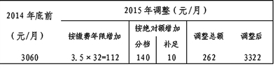 举例说明:李阿姨,全部缴费年限32年,2014年12月的养老金为3060元/月,按图表1的第三档标准,应上调140元,与原养老金相加为3200元。但与2014年12月的养老金低于3050元的第四档人员相比,他们上涨160元后,部分人员会高过李阿姨的3200元(3050元+160元),所以再对李阿姨提高10元,使她达到第四档的最高额3210元。在绝对额的调整中,李阿姨实际每月增长的养老金是150元;再加上按缴费年限调整的养老金,实际共增加养老金262元/月【见图表2】。