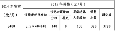 举例说明:王大爷,全部缴费年限40年,2014年12月年满68周岁,基本养老金水平3400元/月。王大爷每月增加养老金380元,调整之后基本养老金水平3780元/月。【见图表4】。