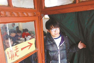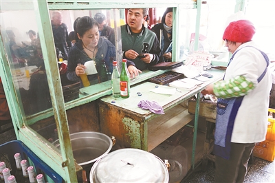 撩开绿色的厚门帘进屋,上世纪70年代的“国营”老店重现眼前,老木头凳子、老吊扇、阴暗的灯光、白墙下绿色的墙围子、挂着红笔写在黄纸上的菜单、用杯称论两卖的二锅头、柜台上沾满油污的大算盘……