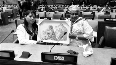 在联合国总部一层大厅的公共展区内,田凤银的10幅版画作品与欧美、非洲等各大洲的女性艺术家作品共同展出。她作品中不断出现的中国长城画面,引来了很多参会者的关注和好评。