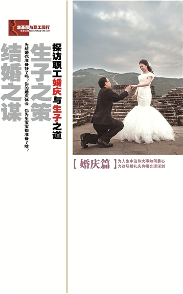 婚礼则成为结婚最直接的表征形式,为了一生中最美丽的时刻,每个人都希望自己的婚礼能够办得隆重一些、体面一些。婚礼对于每个人来说都是最难忘,最幸福的,结婚意味着人生一个新阶段的开始,当耳边回荡着动人心旌的乐曲,当眼前变换着迷人的灯光,楚楚动人的新娘和潇洒英俊的新郎,步入辉煌的婚礼殿堂,举起金色的引火器,点燃神圣的烛光,摇曳的烛光映衬着时尚浪漫高雅的婚礼……婚礼的前前后后:拍婚纱照、准备婚房、选择婚宴地点……都是新人面临的选择,本期记者采访了为婚礼忙碌的职工朋友,让他们说说感受和经验。