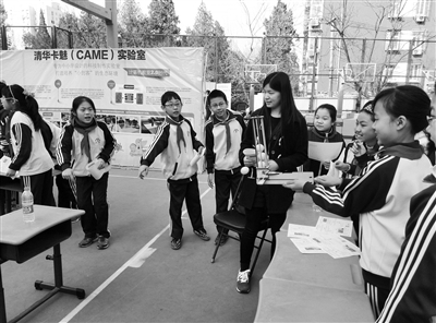在清华科学创意游戏体验区,“一箭双雕”、“诸葛连弩”等游戏让学生们玩得不亦乐乎。“一箭双雕”是用投石器发射乒乓球,要求穿过两米外学生举着的两个孔;“诸葛连弩”是发射自制连弩,要求射中两米外的矿泉水瓶。两个游戏看着简单,却蕴含着抛物线原理、测算小孔角度、直线运动等多个知识,根据参加者穿过或射中的级别打分。