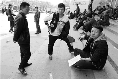 随着春季的到来,外来务工者又开始掀起找工作的热潮。然而,在许多招聘市场都有很多不符合规范的企业暗自招工。记者在宣武人才市场门外广场看到,很多用工单位手拿招聘纸样招工,这里每天聚集100多人。在这里要提醒找工作的人们,要到正规人才市场应聘以保护你的合法权益。本报记者 周世杰 摄影报道
