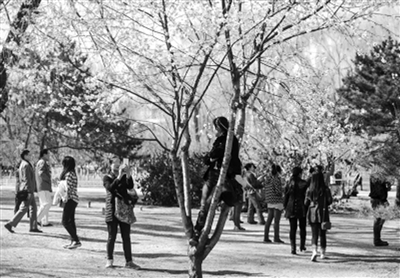 昨天,有网友爆料,玉渊潭公园赏樱花的游客出现爬树、扳枝等不文明现象。公园管理人员称,这种不文明现象不仅妨碍了其他游客正常观赏,也可能造成樱花树倾斜,花朵过早凋谢。(3月24日《京华时报》)
