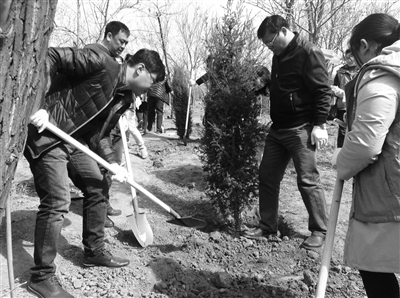 3月20日,中建一局总承包公司先锋志愿队60余人,来到北京老山城市休闲公园,种下了30余株松树。活动现场,公司工会主席于震一边栽树一边对记者说:“这一片山林我们领养了,希望明年能够看见绿树成荫。”本报记者 马超 摄影报道