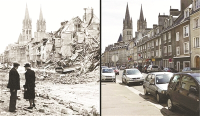 这是诺曼底登陆日旧照与现照的对比照片。在卡昂战役后,民众看着加拿大推土机清理废墟,一座教堂塔在盟军轰炸中幸免于难。现在,这里的大部分都已经重建,晒日光浴放松的游客替代了曾被战友照顾的伤兵。