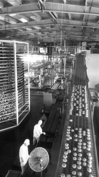很多人都吃过肯德基,但少有人知道肯德基的汉堡就出自古船面包。走进古船面包生产车间,一台高大的面包加工设备出现在眼前,从原料到成品,一条龙的全自动生产,场面让人瞠目,无数个汉堡面包就在这条巨大的生产线上流转。古船面包公司总经理陈伟告诉记者,“这台生产线每小时可生产24000个汉堡。”