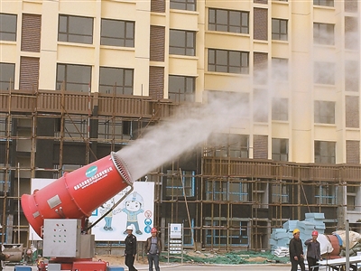 工地降尘用上大口径“喷雾炮”,这是记者近日在中建二局三公司中建城项目上看到的一景。这种大口径“喷雾炮”专门用于工地降尘,有效地控制了施工扬尘,受到地方政府及周边居民的好评。位于河北唐山丰润的中建城项目建筑规划面积100多万平方米,现已开工40万平方米,工地周边是居民小区及体育场,扬尘治理工作的好坏,直接影响到周边居民的生活质量。项目采用的这种直径为60厘米的大口径“喷雾炮”,射程在40米左右,可360度旋转,喷出的雾团状水雾能有效控制施工现场扬尘。