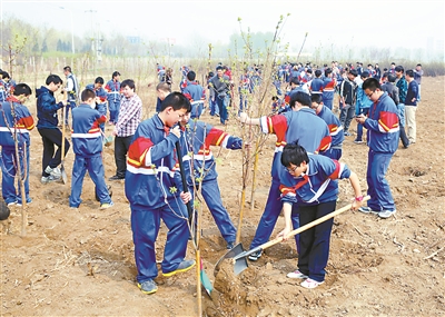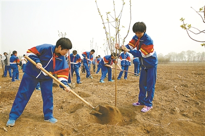 4月11日,五中分校学生在京郊顺义区“太阳村”植树。当日,北京市第五中学分校的百余名学生及青年教师来到京郊顺义区“太阳村”开展爱心植树活动,并为“太阳村”的孩子们送上文具、图书、体育用品等礼物。北京“太阳村”由一家民间慈善机构运营,多年来坚持收养无人抚养的服刑人员未成年子女,并为他们提供特殊教育、心理辅导、权益保护及职业培训等服务。(新华)