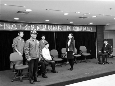 本报讯 (记者 陈曦)西城区德胜街道总工会近日举办“法律培训讲堂”活动,除了律师讲课,全总话剧协会还带来了维权话剧《加薪风波》的基层首演。活泼的形式、诙谐的语言、精彩的表演……30分钟的话剧成为了最让职工和工会主席们惊喜的“开胃菜”。