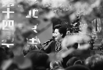 4月11日,在北京法源寺,诗人在丁香树下朗诵诗歌。当日,由北京市西城第二图书馆主办的第十四届丁香诗会如约在法源寺举行。广大诗歌爱好者及社区群众徜徉香雪海中,吟诵激昂诗篇,畅谈中国梦想,抒发爱党爱国情怀。