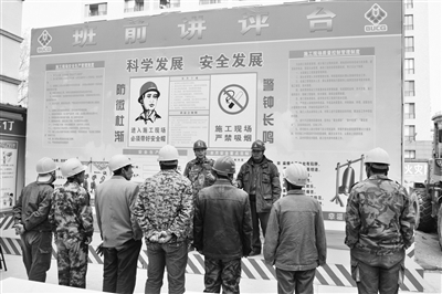 北京城建二公司中科院经理部近日在承建中科院地质与地球物理研究所科研楼工程中,专门在施工现场大门口设立了安全讲评台,做到施工不停止,安全教育不下课。所有施工班组上岗前,先要到安全讲评台前站一站,听安全员讲解施工操作中的安全注意事项,让工人们受到安全教育后再进入现场施工。 (城建二)