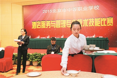 2015年北京市中等职业学校技术技能比赛昨天举办酒店服务与管理专业分赛,北京市外事学校等8所开设该专业的本市中职校派出选手参赛,其中40人参加中餐摆台项目,51人参加中式铺床项目。100件餐具必须在18分钟内摆完;床单的每个角度都要用尺子衡量……选手们有板有眼的技能展示,显示出过硬的职业技能,让现场观摩的企业负责人频频点头。本报记者 任洁 摄影报道