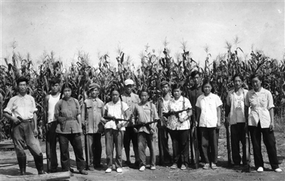 8月11日训练结束后,民兵战士以玉米地为背景,每个人都手持武器,合影留念。大家目视前方,虽谈不上是飒爽英姿,但精神饱满,一点儿也看不出训练后的疲劳,表现出了上世纪50年代年轻人特有的精神风貌。