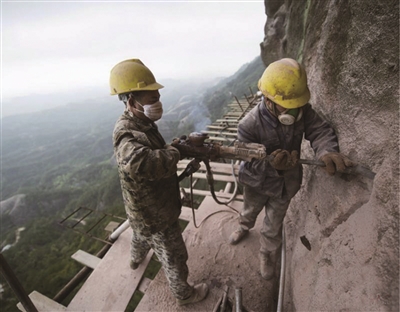 这是一支来自湖南和江西的栈道施工队,工人们每天的作业时间是清晨6点到下午5点。日薪为300-400元左右。打眼工和搭架工是栈道工种中危险系数最高的。在施工现场,张敬发就像“蜘蛛侠”一般吊挂在绝壁上。一阵风吹来,他便随风荡来荡去。“已经习惯了,做好安全措施后也没那么可怕。现在家里还有两个小孩上学,修栈道收入不错,我是家里唯一的经济支柱。”