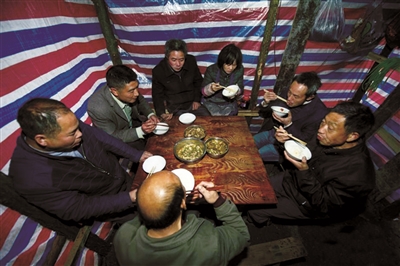仅仅是看照片中这些职工的工作场景,就已经让我们有些心惊肉跳。仅仅看照片中这些职工很普通的一顿晚餐,就已经让我们唏嘘不已。别说有恐高症的人干不了这活,即便是胆大之人整日里在这绝壁山崖上工作,其危险概率都心知肚明啊。而这端着碗吃饭的六个大老爷们儿面前只摆了三盘菜!够吃吗?好吃吗?盘里的菜看上去也没什么油水啊。昏暗的灯光下,吃得爽快吗?都说牛挤的是奶,吃的是草。这些劳动者干的是玩命的活,吃的可是清汤挂水的菜。