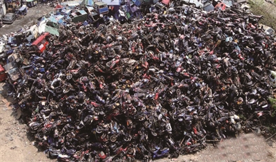 12日,杭州报废车停车场内,三轮电摩及各种摩托车密密麻麻重重叠叠地堆积在一起,从高空中俯瞰场面震撼。据负责人介绍,这些摩托车、违规电动车都是近几年交警专项整治集中清理收集起来的。秦人 摄